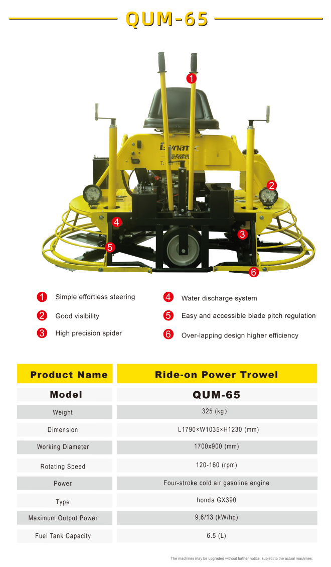 Introduction:Ride-on trowel machine series products are equipped engines like Honda, Bailiton etc., providing powerful performance.The transmission system is efficient and simple, stable and reliable; Heavy load large worm gear box, prevent oil leakage. Products enjoy the world, widely praised by professional users.