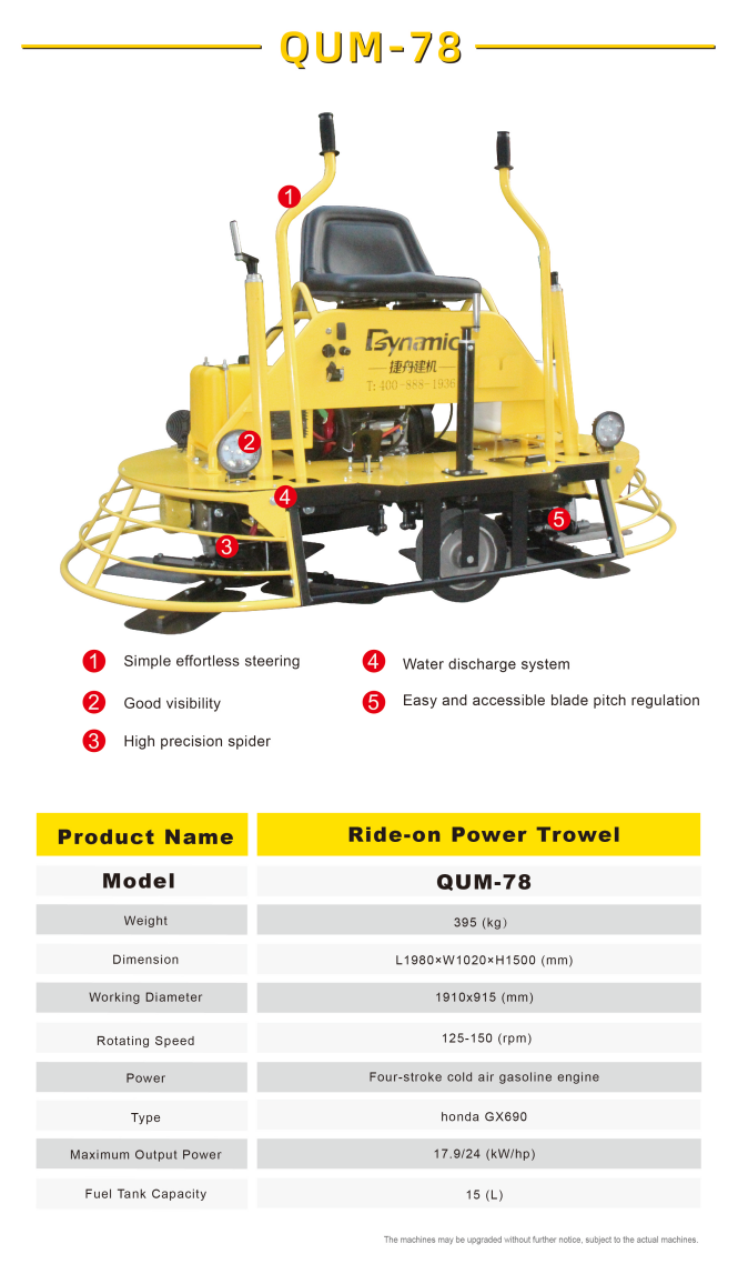 Dynamic Ride-on Trowel series could greatly increase work efficiency for surface of concrete rasied paste and trowel, smooth out.Widely used in building large area ground like factory, warehouse, square and so on.