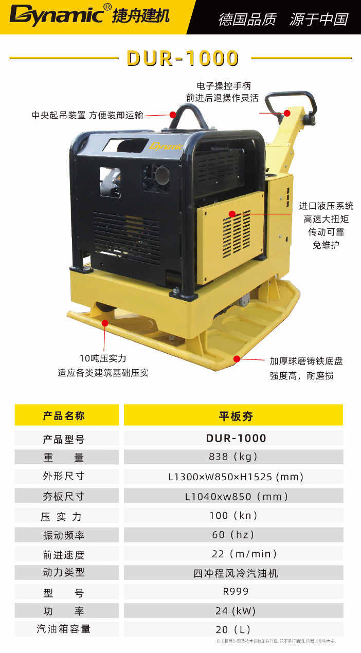 DUR-100平板夯,自重722kg,壓實能力100kN(約10噸),憑借其卓越的設(shè)計和精湛的制造工藝,確保機(jī)器在運(yùn)行過程中發(fā)揮完美性能。標(biāo)配Rato R825發(fā)動機(jī),功率20kW,動力強(qiáng)勁,維護(hù)簡便。一鍵電子點(diǎn)火,啟動快捷方便。此外,還可選配高品質(zhì)柴油發(fā)動機(jī)。同時,也可選配符合EPA認(rèn)證的發(fā)動機(jī)。
